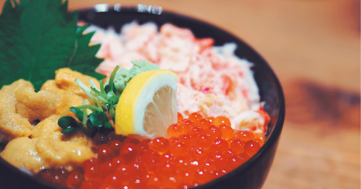 一般的にウニ、イクラ、カニ、ホタテ、マグロ、サーモンなどが彩り豊かに盛られます。